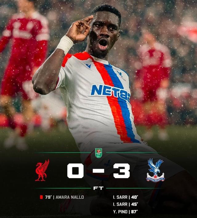英联杯利物浦0-3遭水晶宫淘汰,伊斯梅拉-萨尔双响,纳洛直红